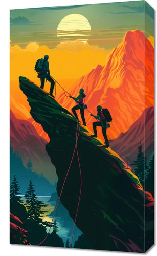 Obraz z serii abstrakcja zatytułowany U Szczytu przedstawia grupę wędrowców wspólnie zdobywających szczyt górski przy zachodzie słońca. Scena jest nasączona żywymi odcieniami pomarańczy i czerwieni, które tworzą dramatyczny, ale piękny kontrast z ciemnozielonymi drzewami i skalistym terenem. Sylwetki wędrowców są w centrum kompozycji, wyraźnie zarysowane przeciwko tłu światła słonecznego, co podkreśla ich osiągnięcie i trud włożony w zdobycie szczytu. Przepiękny zachód słońca z dużym, jasnym słońcem na horyzoncie nadaje całej scenie uczucie spokoju i spełnienia. Obraz ten oddaje ducha przygody i piękno natury, idealny dla miłośników gór i tych, którzy cenią siłę ludzkiego ducha. Doskonały do dekoracji ścian w domach, schroniskach górskich lub jako inspiracja w przestrzeniach, gdzie docenia się przyrodę i aktywny tryb życia.