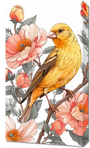 Obraz z serii natura zatytułowany Wiosenny Śpiewaczek przedstawia pełną detali i życia scenę, w której jaskrawo żółty ptak, przypominający kanarka, spoczywa na gałęzi wśród kwitnących kwiatów. Delikatne i subtelne kolory kwiatów w pastelowych odcieniach różu i pomarańczu tworzą miękki kontrast do żywego upierzenia ptaka. Precyzyjne linie i staranne cieniowanie nadają ilustracji realistycznego wyglądu, a roślinność w tle jest równie szczegółowo wykonana, co dodaje kompozycji głębi i bogactwa. Ten obraz to celebracja wiosennego odrodzenia i piękna natury, idealny do ożywienia każdego wnętrza, szczególnie pokoju dziennego, przestrzeni odpoczynkowej lub kawiarni o przytulnej atmosferze.