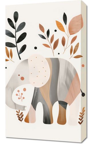 Obraz z serii wnętrza zatytułowany Wypocznij Mały przedstawia stylizowaną ilustrację słonia, wplecionego w delikatną kompozycję z abstrakcyjnymi elementami roślinnymi. Słoń jest przedstawiony w spokojnej, stonowanej palecie kolorów z akcentami ciepłych brązów, beżów i delikatnych szarości, co nadaje ilustracji elegancki i nowoczesny charakter. Proste, ale efektowne formy roślinne wokół słonia dodają plakatowi lekkości i harmonii, a dyskretne kropki i linie na ciele słonia tworzą wrażenie tekstury. Całość tworzy obraz spokoju i łagodności, idealny do wnętrz, w których chce się wprowadzić elementy natury i uspokajającej estetyki, takich jak salony, pokoje relaksacyjne lub przestrzenie dla dzieci.