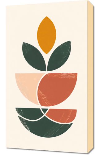 Obraz z serii minimalistyczne zatytułowany Zrównoważony Wzrost. Ta grafika to uproszczona, ale sugestywna reprezentacja wzrostu rośliny, przedstawiona za pomocą geometrycznych form. Symetryczne ułożenie elementów w ciepłych, naturalnych barwach zieleni, musztardowego żółcieni i terrakoty symbolizuje harmonię i naturalny rozwój. Całość tworzy wyważoną i przyjemną dla oka kompozycję, która może symbolizować równowagę i spokój.Ten obraz będzie pięknie komponował się z wnętrzami utrzymanymi w naturalnym stylu lub przestrzeniami, które akcentują zrównoważony rozwój i ekologiczny styl życia. Idealny dla jasnych, spokojnych przestrzeni, takich jak domowe biura, przestronne salony lub jadalnie, gdzie wprowadzi dodatkowy element natury i harmonii.