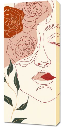 Obraz z serii abstrakcja zatytułowany Beż i Twarz. Obraz przedstawia stylizowany, linearny portret kobiety z zaznaczonymi konturami w ciepłych odcieniach beżu i różu. Twarz kobiety jest uchwycona w profilu, z subtelnymi detalami takimi jak delikatnie zamknięte oko, zarysowane usta oraz zaznaczone linie nosa i brwi. Kompozycja łączy w sobie elementy botaniczne – różę umieszczoną w górnej części obok głowy, co nadaje dziełu romantyczny i subtelny charakter. Liście i łodyga róży wiodą wzrok od dolnej części obrazu aż po jej głowę, tworząc spójną, pionową linię. Użyte kolory są ograniczone do kilku pastelowych odcieni, co sprawia, że obraz jest zarówno spokojny, jak i elegancki. Idealnie sprawdzi się jako element dekoracyjny w przestrzeniach nowoczesnych, jak i tych urządzonych w stylu vintage.