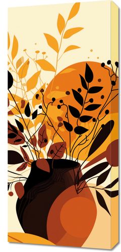 Obraz z serii minimalistyczne zatytułowany Bukiet Owoców. Grafika ta przedstawia estetyczny układ liści i owoców jesieni w klasycznym, ciemnym wazonie, umieszczony na tle ciepłych, okrągłych form w tonacji jesiennej palecie. Gama kolorów rozciąga się od intensywnego mahoń do miękkiego złota, przywołując uczucie ciepła, które towarzyszy złotej porze roku. Przemyślne rozpryski i drobne detale nadają całości dynamiki, sugerując żywotność i obfitość jesiennych plonów. Obraz ten idealnie odnajdzie się w przytulnych wnętrzach, wnosić będzie atmosferę spokoju i refleksji. Idealnie nadaje się do salonów, pokojów dziennych lub przestrzeni, gdzie dominuje naturalna paleta barw i materiałów.