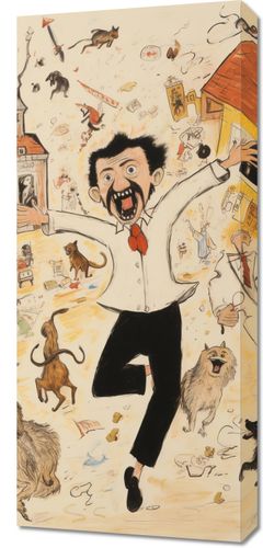 Obraz z serii pejzaże u00a0zatytułowany Chaos w Miasteczku. Ekscytująca scena pełna dynamicznych postaci i zwierząt wydaje się być niekończącym się źródłem zabawy i śmiechu. Główny bohater z szeroko otwartymi oczami i wyraźnym wyrazem twarzy zdaje się być zaskoczony otaczającym go bałaganem, podczas gdy psie postacie dodają uroku i komizmu całemu obrazowi. Kolorowe detale, takie jak budynki, zabawki i codzienne przedmioty, tworzą żywą i zabawną atmosferę. Świetnie sprawdzi się w pokojach dziecięcych, kawiarniach tematycznych oraz miejscach dedykowanych humorowi i rozrywce.