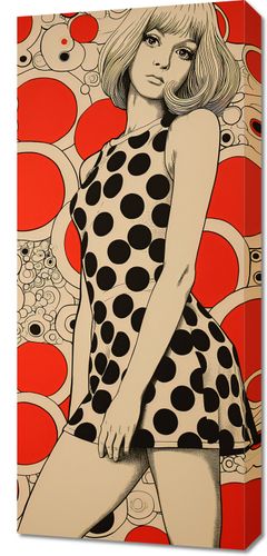 Obraz z serii pop art zatytułowany Czerwone Kropki. Prezentuje modną kobietę w czarnej sukience w białe kropki, która pozuje na tle żywego, czerwonego tła z abstrakcyjnym wzorem kołowym. Jej postać i suknia są przedstawione w odcieniach czerni i szarości, co tworzy silny kontrast z tłem. Obraz oddaje ducha epoki pop-artu, łącząc minimalistyczny portret z dynamicznym i odważnym wzorem. Idealnie wpasuje się w nowoczesne wnętrza oraz przestrzenie kreatywne, takie jak studia projektowe, galerie sztuki czy modowe butiki.