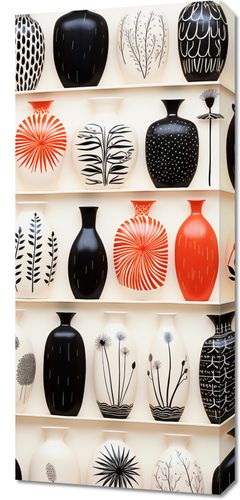 Obraz z serii wnętrza zatytułowany Gliniana Harmonia. Precyzyjnie ułożone wazony na półkach prezentują się niczym w muzeum sztuki użytkowej. Ich geometryczne i roślinne wzory, oscylujące między czernią, bielą i czerwienią, tworzą hipnotyzującą kompozycję. Prostota i elegancja tych przedmiotów, w połączeniu z ich zróżnicowaną fakturą i wzornictwem, dodają wnętrzom niepowtarzalnego charakteru. Idealnie komponują się zarówno w nowoczesnych loftach, jak i tradycyjnych pokojach kolekcjonera. Ta estetyczna kolekcja doskonale odda atmosferę w galeriach designu oraz w ekskluzywnych salonach z antykami.