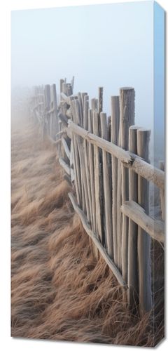 Obraz z serii pejzaże zatytułowany Mgła nad Wydmami. Prezentuje on eteryczny widok na drewniane ogrodzenie, które wiedzie przez poszarpane, suchą trawę wydm. Delikatna mgła otula scenę, nadając jej tajemniczość i spokój, a subtelne odcienie szarości i beżu tworzą uczucie miękkości i ciepła. Ten obraz idealnie oddaje atmosferę wyciszenia i rozmyślania, sprawiając, że jest doskonałym wyborem dla przestrzeni, które mają na celu uspokojenie i relaks, jak spa, pokoje medytacyjne, czy ciche kąciki w domach. To także piękny element dekoracyjny dla wnętrz inspirowanych naturą i spokojem przyrody.