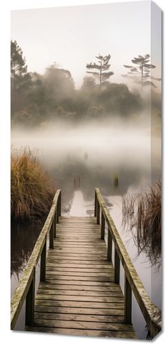 Obraz z serii pejzaże zatytułowany Most do Tajemnicy. Na tym mistycznym obrazie drewniana kładka prowadzi nas ku tajemniczej mgle, która delikatnie spowiła powierzchnię spokojnego stawu. Złote trzciny i zarysy drzew rzucają się w oczy na tle zamglonego poranka, tworząc uczucie ciepła i spokoju. Ten obraz oddaje piękno niewidzialnego świata, który czai się tuż za zasłoną mgły, zachęcając widza do refleksji i odkrywania nieznanego. Idealnie nadaje się do wnętrz, gdzie dominuje natura i spokój, takich jak salony spa, pokoje relaksacyjne, czy prywatne biblioteki. To wyjątkowy element dekoracyjny, który może przynieść element kontemplacji i odprężenia do każdego domu lub przestrzeni publicznej.