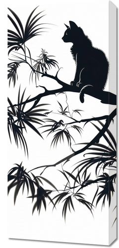 Obraz z serii wnętrza zatytułowany Na Gałęzi przedstawia sylwetkę kota siedzącego na gałęzi, zarysowaną na tle jasnego, jednolitego tła. Całość kompozycji utrzymana jest w stylu sumi-e, nawiązującym do tradycyjnej wschodniej techniki tuszem. Kontury kota i roślin są wyraziste, z delikatnymi szczegółami, które przywodzą na myśl efekt cieniowania i głębi. W tle roślinność, prawdopodobnie bambus lub tropikalne palmy, jest przedstawiona w sposób stonowany, co wskazuje na użycie gradientu cieni. Grafika ta oddaje spokój i harmonię, charakterystyczne dla azjatyckiej estetyki i sztuki. Idealnie nadawałaby się jako dekoracja w przestrzeniach inspirowanych minimalizmem i naturą.