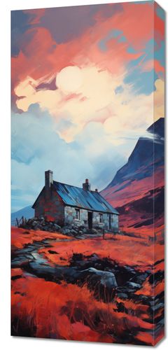 Obraz z serii pejzaże zatytułowany Ostatni Bastion. Obraz przedstawia osamotniony domek umiejscowiony w surowym, ale majestatycznym krajobrazie, pod dramatycznym niebem o intensywnych odcieniach czerwieni i błękitu. Zmierzch słońca rzuca ciepłe światło na dzikie, wrzosowe pola, tworząc kontrast z chłodnymi tonami górskiego tła. Ten obraz wyraża surowe piękno i niezłomność natury, a także ludzką tęsknotę za prostotą i ciszą. Idealnie nadaje się do wnętrz, które pragną wprowadzić poczucie spokoju, odosobnienia i kontemplacji natury.