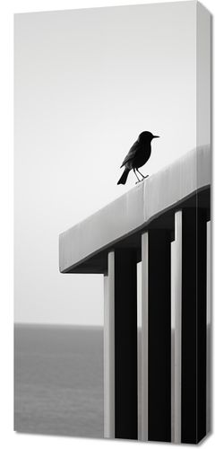 Obraz z serii pejzaże zatytułowany Samotna Odchłań. Ten skrajnie minimalistyczny obraz przedstawia pojedynczego ptaka spoczywającego na czystej, białej krawędzi konstrukcji, z subtelnym tłem nieskończonego morza. Zdjęcie w skali szarości, gdzie tylko kontury ptaka wyróżniają się na jednolitym tle, wywołuje poczucie spokoju i introspekcji. Idealny dla nowoczesnych przestrzeni biurowych i domowych, które pragną oddać hołd prostocie i skupieniu, a także jako przemyślany akcent w galeriach sztuki czy minimalistycznych salonach.