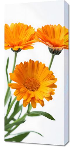 Obraz z serii wnętrza zatytułowany Słoneczne Kalendule. Zaprezentowano na nim trzy jaskrawe, żywiołowe kwiaty kalenduli, które rozkwitają na tle czystej bieli. Ich intensywnie pomarańczowe płatki i wyraziste, bogate środki stanowią symbol radości i optymizmu. Delikatne cienie i gra światła na płatkach dodają głębi i realizmu, sprawiając, że kwiaty wydają się niemal trójwymiarowe. Ten obraz może wprowadzić element natury i świeżości do każdego wnętrza, będąc idealnym wyborem dla przestrzeni, które cenią sobie jasność i lekkość, takich jak salony, pokoje relaksacyjne czy kliniki wellness.