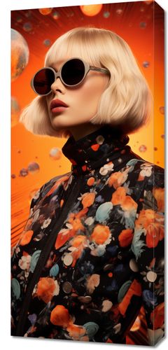 Obraz z serii pop art zatytułowany Słoneczny Akcent. Ten ekscytujący obraz łączy w sobie klasykę mody z elementami astrologii, prezentując postać kobiety w eleganckich okularach przeciwsłonecznych i kurtce w kwiatowy wzór. Tło w intensywnych odcieniach pomarańczy i czerwieni, z graficznymi przedstawieniami planet, nadaje kompozycji kosmiczną atmosferę. Modny bob i minimalistyczne okulary stanowią nowoczesny akcent, który w połączeniu z odważnym tłem tworzy wyjątkową wizję. Obraz jest idealny dla przestrzeni, które pragną wprowadzić modną, a jednocześnie kosmiczną atmosferę – doskonały do nowatorskich salonów, pracowni mody lub jako wyrazisty element dekoracyjny w prywatnych domach miłośników designu.