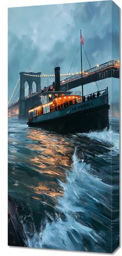 Obraz z serii abstrakcja zatytułowany Stary Parowiec uchwycił nostalgiczny obraz starego parowca przemierzającego wody przy mrocznym niebie, z tłem rozświetlonego mostu. Światła na parowcu rzucają ciepły blask na fale, tworząc złoty refleks na powierzchni wody, co kontrastuje z chłodnymi odcieniami burzowych chmur i zmierzchu. To malownicze przedstawienie, połączone z dynamiczną grą świateł i cieni, tworzy romantyczną i pełną atmosfery scenę, która przyciąga oko i wywołuje uczucie sentymentu do dawnych czasów. Idealnie nadaje się do zawieszenia w przestrzeniach, gdzie chcemy dodać element historycznej elegancji i marzycielskiego nastroju, takich jak biblioteki, studia, a nawet salony.