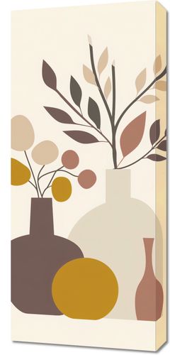 Obraz z serii minimalistyczne zatytułowany Stonowane Naturmorta. Artystyczne przedstawienie klasycznego naturmorta ożywione zostało poprzez minimalistyczne kształty i spokojną paletę barw. Butelki i wazy o prostych formach, wypełnione są stonowanymi okręgami i liśćmi, które przypominają delikatne kompozycje florystyczne. Barwy ziemi – od ciepłych beżów po głębokie brązy – są połączone z subtelnością, tworząc wyrafinowany i spokojny nastrój.Ten obraz doskonale wpisze się w dekorację nowoczesnych, stonowanych wnętrz, gdzie jego elegancja i subtelność mogą być w pełni docenione. Idealny do umieszczenia w salonie, sypialni lub biurze, doda każdemu z tych miejsc ciepła i domowej atmosfery, zachowując przy tym czystość i prostotę linii.