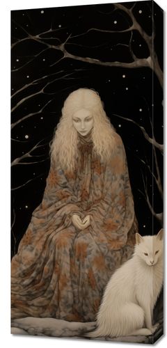 Obraz z serii wnętrza zatytułowany Stróżka Leśna. Ta eteryczna praca artystyczna ukazuje postać kobiecą, owiniętą w szatę z motywem leśnym, zatopioną w kontemplacji pod gałęziami drzew oplecionych przez śnieg i w blasku pełnego księżyca. Jej spokojna obecność i blady odcień skóry kontrastują z ciemnością nocy, a towarzyszący jej biały wilk dodaje elementu dzikości i tajemniczości. Obraz oddaje uczucie spokoju i jedności z naturą, a jednocześnie wzbudza ciekawość dotyczącą ukrytych opowieści i starych legend. Idealny dla miłośników fantastyki, mitologii, oraz tych, którzy pragną wprowadzić do swojego wnętrza elementy oniryczne i magiczne.