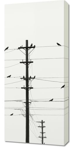 Obraz z serii pejzaże zatytułowany Symfonia na Drutach. Prezentuje on prostotę miejskiego krajobrazu, gdzie ptaki siedzą równomiernie rozmieszczone na przewodach telefonicznych. Czyste tło i sylwetki ptaków na linii energetycznej tworzą graficzny i rytmiczny wzór, który jest zarówno spokojny, jak i dynamiczny. Ten obraz to hołd dla nieoczekiwanej urody w codziennych scenach miejskich, idealny dla tych, którzy cenią sobie prostotę i nowoczesny design. Pasuje do nowoczesnych wnętrz biurowych, minimalistycznych salonów oraz wszędzie tam, gdzie sztuka ma za zadanie wprowadzać element spokoju i porządku.