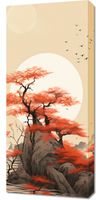 Obraz z serii pejzaże zatytułowany Szepty Wiatru. Niesamowity krajobraz z jaskrawo czerwonymi drzewami rosnącymi na majestatycznej skale, której kształty wydają się być ukształtowane przez wieki. Błyszczący biały księżyc oświetla spokojne wody, które otaczają skale, podczas gdy stado ptaków przenika przez jasne niebo, dodając uczucie przestrzeni i nieskończoności. Subtelne odcienie szarości i biele w tle tworzą kontrast dla wyrazistych czerwieni drzew, nadając scenie głębię i dramatyzm. Idealny do ozdoby salonów medytacyjnych, gabinetów terapeutycznych lub luksusowych hotelowych holów.