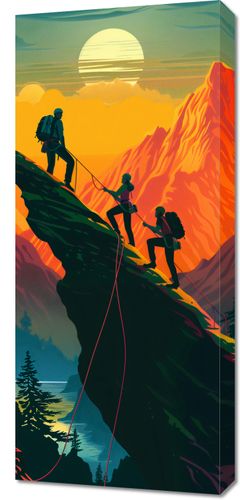 Obraz z serii abstrakcja zatytułowany U Szczytu przedstawia grupę wędrowców wspólnie zdobywających szczyt górski przy zachodzie słońca. Scena jest nasączona żywymi odcieniami pomarańczy i czerwieni, które tworzą dramatyczny, ale piękny kontrast z ciemnozielonymi drzewami i skalistym terenem. Sylwetki wędrowców są w centrum kompozycji, wyraźnie zarysowane przeciwko tłu światła słonecznego, co podkreśla ich osiągnięcie i trud włożony w zdobycie szczytu. Przepiękny zachód słońca z dużym, jasnym słońcem na horyzoncie nadaje całej scenie uczucie spokoju i spełnienia. Obraz ten oddaje ducha przygody i piękno natury, idealny dla miłośników gór i tych, którzy cenią siłę ludzkiego ducha. Doskonały do dekoracji ścian w domach, schroniskach górskich lub jako inspiracja w przestrzeniach, gdzie docenia się przyrodę i aktywny tryb życia.