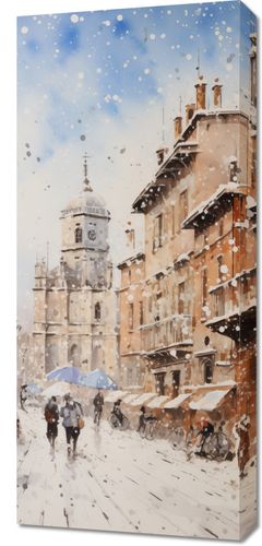 Obraz z serii pejzaże zatytułowany Urok Starych Miast. Ten malarski obraz ukazuje malowniczą, zasypaną śniegiem uliczkę miasta, gdzie delikatne płatki śniegu tańczą w powietrzu, a zabytkowe fasady budynków otulone są białym puchem. Scena tętni życiem dzięki postaciom przechadzającym się spokojnie pod parasolami i kontrastowi ciepłych tonów architektury z chłodnymi odcieniami zimowego nieba. Obraz ten oddaje atmosferę spokojnej zimowej sielanki i jest idealny do wnętrz klasycznych, jak również współczesnych, gdzie może wprowadzić element nostalgii i czasu zatrzymanego w kadrze.