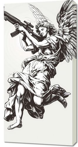 Obraz z serii pop art zatytułowany Anioł Wojny. Przedstawia on postać anioła w klasycznym stylu, jednak z nieoczekiwanym elementem współczesnym – trzyma on broń, co jest zaskakującym połączeniem tradycyjnej symboliki z nowoczesnymi motywami. Ta silna wizualna metafora może prowokować do refleksji na temat konfliktów, pokoju i dwoistości natury ludzkiej. Zastosowanie monochromatycznej kolorystyki wzmacnia dramatyzm kompozycji, a sama praca może stanowić wyrazisty akcent w nowoczesnych przestrzeniach, które cenią sobie głęboką symbolikę i odważne wyraz artystyczny.