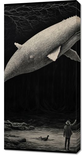 Obraz z serii abstrakcja zatytułowany Biały Wieloryb. Ta tajemnicza i prowokująca grafika przedstawia surrealistyczne spotkanie człowieka z ogromnym wielorybem w ciemnym, leśnym otoczeniu. Monochromatyczna paleta barw i szczegółowe tekstury nadają tej scenie wygląd ręcznej ilustracji. Wieloryb, unoszący się w powietrzu, stwarza wrażenie ciszy i spokoju, podczas gdy postać człowieka, zwrócona ku niemu, wprowadza element refleksji i głębokiej łączności z naturą. Obraz ten jest idealnym wyborem dla miłośników sztuki, którzy cenią sobie niestandardowe i głębokie przesłanie, doskonale nadaje się do osobistych przestrzeni medytacyjnych, nowoczesnych salonów, czy jako mocny akcent w galeriach sztuki.
