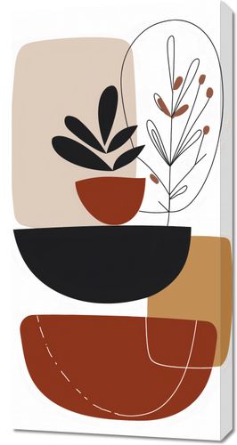 Obraz z serii minimalistyczne zatytułowany Botaniczna Abstrakcja. To artystyczne dzieło przedstawia stylizowane, botaniczne motywy ukryte wśród geometrycznych form. Delikatne rośliny w doniczkach uchwycone są w prostych, ale wyrafinowanych konturach, zaznaczających ich sylwetki na tle złożonego z ciepłych i neutralnych barw tła. Brązy i beże splatają się tu z głęboką czerwienią, tworząc organiczne poczucie natury uproszczonej do esencji formy. Ten obraz doskonale odnajdzie się w przestronnych, jasnych wnętrzach, gdzie natura spotyka się z minimalizmem - idealny do salonów w stylu skandynawskim, spokojnych gabinetów, lub jako ukojenie w dynamicznym, miejskim biurze.
