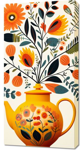 Obraz z serii wnętrza zatytułowany Bujna Herbata. Zachwycające, soczyste barwy kwiatów i liści wyrastających z eleganckiego żółtego dzbanka do herbaty, na którym uwagę przyciągają malowane motywy roślinne. Wzory i kolory wspaniale harmonizują ze sobą, tworząc kompozycję pełną życia i radości. Delikatne linie i estetyczny układ sprawiają, że prace ożywiają każdą przestrzeń. Świetnie sprawdzi się w kawiarniach, herbaciarniach jak i również w domowych jadalniach czy salonach.