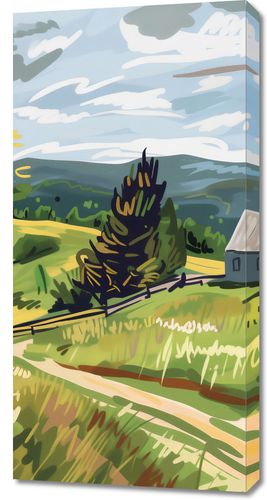 Obraz z serii pejzaże zatytułowany Bujna Wieś. Plakat przedstawia malowniczą scenę z wiejskiego krajobrazu, gdzie dominuje pastelowa paleta barw. W centralnym punkcie obrazu widzimy prostą, białą chłopską chatę z szarym dachem, otoczoną przez bujną, zieloną roślinność i rozległe pola. Drzewa z żółtymi akcentami wskazują na wczesną jesień, a ich rozmieszczenie i forma dają wrażenie naturalnego, rustykalnego otoczenia. Jasne, dynamiczne pociągnięcia pędzlem na niebie nadają scenie lekkości i ruchu, podczas gdy delikatnie zaznaczone wzgórza w tle oferują poczucie głębi i przestrzeni. Kolorystyka obrazu, łącząca ciepłe odcienie żółci z chłodnymi błękitami, przyciąga oko i sprawia, że scena jest zarówno spokojna, jak i energetyczna. Ta ilustracja może przywoływać uczucia nostalgii i spokoju, a także zachęcać do refleksji nad pięknem prostego życia na wsi.