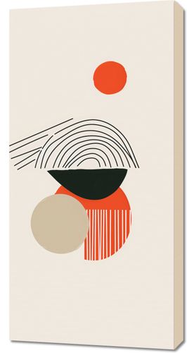 Obraz z serii boho zatytułowany Centralne Słońce to dzieło artystyczne utrzymane w stonowanej palecie kolorystycznej, na którym dominują geometryczne kształty i linie. Na górnej części kompozycji widnieje małe, jaskrawe czerwone koło, które może symbolizować słońce lub inny punkt centralny. Poniżej znajduje się czarna, półokrągła forma z koncentrycznymi liniami, przypominającymi ułożenie naturalnych warstw kamienia lub drzewa. Tuż obok, kontrastujące z nią, znajduje się większe, jasno beżowe koło, które wraz z czarnym półkolem tworzy iluzję przestrzeni. Na dole obrazu uwagę przyciąga większe, okrągłe pole w odcieniu ciepłego pomarańczu, na którym znajduje się wzór pasków w kierunku pionowym, dodający tekstury i ruchu. Całość utrzymana jest w estetyce minimalizmu i modernizmu, gdzie każdy element, choć prosty, jest starannie wyważony, by współgrać z resztą kompozycji.