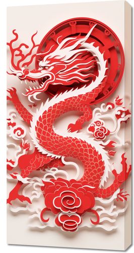Obraz z serii motywy wschodnie zatytułowany Czerwony Smok. Ta intrygująca grafika przedstawia czerwonego smoka w stylu papierowej wycinanki, który wydaje się wyłaniać z tła z potężną siłą i gracja. Smok, symbolizujący szczęście, siłę i dobrobyt w kulturach azjatyckich, został przedstawiony w pełnym ruchu, z płomieniami i chmurami otaczającymi jego ciało. Kolor czerwony dominuje w dziele, co w kulturze chińskiej jest zwiastunem szczęścia i pomyślności. Ten obraz doskonale nada się jako wyraziste dzieło sztuki w każdym wnętrzu, szczególnie polecany jako dekoracja na święto Chińskiego Nowego Roku, w przestrzeniach publicznych takich jak restauracje czy hotele, a także w domach ceniących azjatycką estetykę i symbolikę.