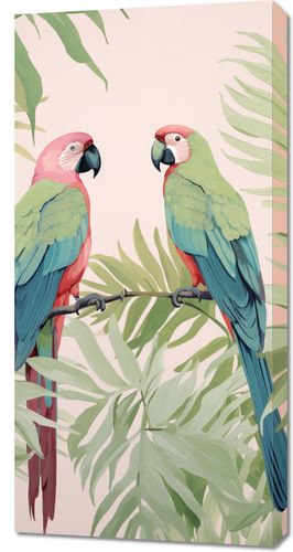 Obraz z serii wnętrza zatytułowany Dialog Ara. Na tej jasnej i pełnej życia ilustracji widzimy dwie papugi ary, które z gracją spoczywają na gałęzi, otoczone tropikalnymi liśćmi palm. Ich wyraziste, kolorowe upierzenie w odcieniach różu, zielonego i błękitu przyciąga wzrok i wprowadza egzotyczną atmosferę do każdej przestrzeni. Obraz ten jest idealnym wyborem dla miłośników natury i kolorowych, radosnych motywów, doskonale nadaje się do wnętrz, które pragną dodać odrobinę tropikalnego ciepła, takich jak jasne salony, dziecięce pokoje, a także jako dekoracja w kawiarniach i restauracjach o egzotycznym charakterze.
