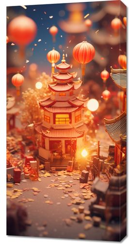 Obraz z serii motywy wschodnie zatytułowany Festiwale Świata. Ta urocza i ciepła kompozycja przedstawia tradycyjny azjatycki dom w sercu starożytnego miasta, rozświetlonego przez setki lampionów unoszących się w powietrzu, co nadaje scenie atmosferę świętowania i radości. Subtelne światło i złote konfetti na pierwszym planie tworzą efekt głębi i magicznego blasku. Obraz ten wprowadza do wnętrza ducha azjatyckiej kultury i jest doskonałym dodatkiem do przestrzeni, które chcą uczcić piękno i tradycję festiwali latarni, takich jak restauracje, salony spa lub jako wyjątkowy akcent w domowych salonach.