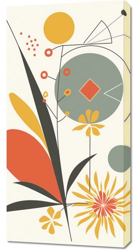 Obraz z serii minimalistyczne zatytułowany Geometryczny Ogród. Obraz ożywia przestrzeń za pomocą zgeometryzowanych motywów przyrody, ukazując śmiałą kompozycję abstrakcyjnych kształtów i organicznych form. Centralne miejsce zajmuje wielowarstwowy obraz geometrycznych kwiatów i liści w ciepłej palecie barw – od żółci, przez pomarańcz, aż po głęboką czerń. Kompozycję uzupełniają finezyjnie rozrzucone kropki i linie, tworzące wrażenie poruszającej się, pulsującej natury zamkniętej w krystalicznych strukturach.Obraz ten będzie doskonałym dodatkiem do nowoczesnych wnętrz, takich jak minimalistyczne salony, biura ze stonowanym wystrojem, czy przestronne hole. Jego spokojne kolory i geometryczne motywy wprowadzą harmonię i artystyczny akcent w każdej przestrzeni, zachowując przy tym subtelność i elegancję.