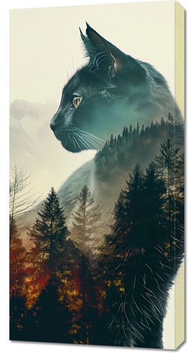 Obraz z serii natura zatytułowany Koci Duch Lasu. Ten obraz prezentuje zaskakującą kompozycję, w której sylwetka czarnego kota płynnie przechodzi w mglisty krajobraz leśny, łącząc świat zwierzęcia z dziką przyrodą. Złote i ciepłe odcienie jesiennego lasu w tle kontrastują z chłodnymi tonami gór, dodając głębi i tajemniczości. Mistyczne połączenie kota z naturą symbolizuje jedność i harmonię między żywymi istotami a otoczeniem, a także podkreśla dziką i niezależną naturę kota. Obraz idealnie nadaje się do przestrzeni mieszkalnych ceniących połączenie sztuki z naturą, takich jak nowoczesne salony, pokoje relaksacyjne lub gabinety, jak również może być inspirującym elementem dekoracyjnym dla gabinetów weterynaryjnych lub przychodni zoologicznych.