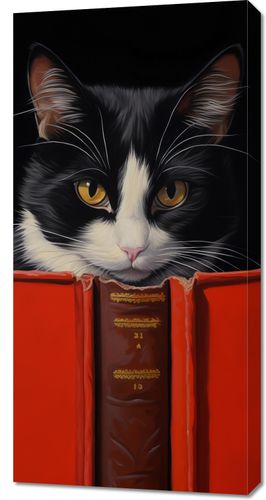 Obraz z serii wnętrza zatytułowany Koci Uczeń. Prezentuje on uroczego, czarno-białego kota z intensywnie żółtymi oczami, zaglądającego ciekawie do czerwonej, otwartej książki. Głęboki czarny tło podkreśla barwy i szczegółowe detale futra kota, a także złocenia na grzbiecie książki. Ten obraz łączy w sobie humor i ciepło, doskonale oddając osobowość i charakter kotów jako towarzyszy domowych. Idealny do umieszczenia w domowych bibliotekach, salonach czy pokojach dziecięcych, plakat ten dodaje wnętrzu przytulności i wprowadza zabawny, intelektualny element.