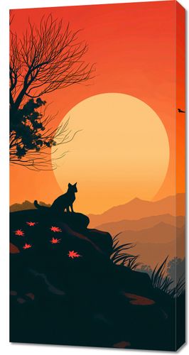 Obraz z serii abstrakcja zatytułowany Kocie Wzgórze ukazuje sylwetkę kota, który usadowił się na wzgórzu, wpatrując się w zachodzące słońce. W tle rozciągają się warstwowe góry, a całość sceny jest nasączona ciepłymi odcieniami pomarańczy i czerwieni, wyrażającymi spokój i harmonię. Drzewo bez liści na pierwszym planie oraz rozsypane po ziemi jesienne liście kontrastują z gładkim tłem, tworząc poczucie głębi i przestrzeni. Ten obraz doskonale oddaje spokojną i refleksyjną atmosferę, idealnie nadając się do pomieszczeń, które cenią sobie ciszę i spokój, takich jak biblioteka, salon, czy miejsce do medytacji.