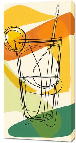 Obraz z serii boho zatytułowany Koktajl Artystyczny to kreatywne połączenie kolorów i linii, które razem tworzą abstrakcyjne przedstawienie szklanki z napojem. Dynamiczne, czarne kontury rysują się swobodnie, sugerując kształt i formę, podczas gdy tło w ciepłych odcieniach żółci i pomarańczy z nutą zieleni dodaje kompozycji letniego klimatu. Ten obraz przyciąga uwagę swoją swobodą formy i świeżością, nadając wnętrzu poczucie radosnej, niezobowiązującej atmosfery. Idealny dla tych, którzy chcą dodać swojemu otoczeniu odrobiny kulinarnego szaleństwa i artystycznego smaku.