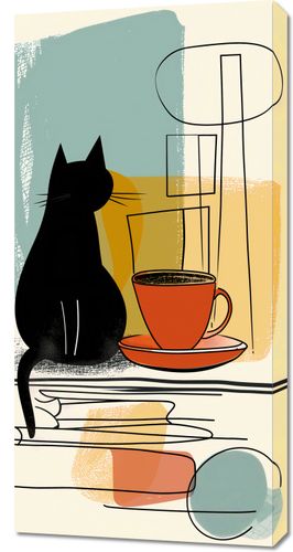 Obraz z serii abstrakcja zatytułowany Kot i Kawa. Ten pełen uroku obraz przedstawia sylwetkę czarnego kota, który wydaje się kontemplować filiżankę kawy. Stylizacja grafiki, z jej czystymi liniami i blokami kolorów w ciepłych odcieniach beżu, ochry oraz stonowanej zieleni i błękitu, tworzy atmosferę spokojnego poranka. Abstrakcyjne elementy w tle, przypominające sztukę modernistyczną, nadają plakatowi współczesnego charakteru. To dzieło sztuki idealnie pasuje do kawiarni, kuchni, a także jako subtelny akcent w nowoczesnym salonie, oferując wizualne wyrażenie komfortu i relaksu.