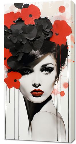 Obraz z serii wnętrza zatytułowany Kwiatowa Pasja. Magnetyczne spojrzenie kobiety zaakcentowane jest eksplozją czerwonych i czarnych kwiatów, które zdają się być przedłużeniem jej duszy. Jej soczyste czerwone usta są echem barwnych petali, które otaczają ją niczym aura. Splaty czerwieni na monochromatycznym tle dodają kompozycji dynamiki i nieprzewidywalności. Idealnie odnajdzie się w luksusowych apartamentach oraz w eleganckich salonach kosmetycznych.