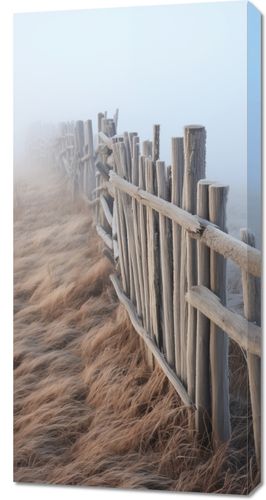 Obraz z serii pejzaże zatytułowany Mgła nad Wydmami. Prezentuje on eteryczny widok na drewniane ogrodzenie, które wiedzie przez poszarpane, suchą trawę wydm. Delikatna mgła otula scenę, nadając jej tajemniczość i spokój, a subtelne odcienie szarości i beżu tworzą uczucie miękkości i ciepła. Ten obraz idealnie oddaje atmosferę wyciszenia i rozmyślania, sprawiając, że jest doskonałym wyborem dla przestrzeni, które mają na celu uspokojenie i relaks, jak spa, pokoje medytacyjne, czy ciche kąciki w domach. To także piękny element dekoracyjny dla wnętrz inspirowanych naturą i spokojem przyrody.