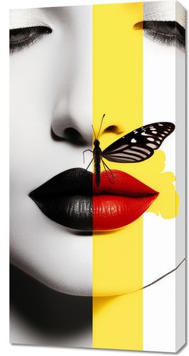Obraz z serii abstrakcja zatytułowany Motyla Piękność. Ten obraz przedstawia twarz kobiety podzieloną na dwa kontrastujące segmenty: jeden w czerni i bieli, drugi w żywych kolorach z motylem na ustach. Ilustracja eksploruje temat dualizmu natury ludzkiej, piękna i jego zmienności. Obraz ten jest idealnym wyborem dla przestrzeni o współczesnym designie, takich jak salony piękności, studia artystyczne, a także jako wyrazisty element dekoracyjny w nowoczesnych domach.