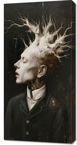 Obraz z serii abstrakcja zatytułowany Myśli Wzrastające prezentuje surrealistyczny portret mężczyzny, z którego głowy wyłania się skomplikowana struktura przypominająca korzenie lub gałęzie drzewa. Ten organiczny koronament wyrasta z myśli postaci, symbolizując rozwój, kreatywność i złożoność ludzkiego umysłu. Kontrast między żywą bielą i szarościami struktury a głębokim, ciemnym tłem sugeruje głębię i intensywność wewnętrznego świata postaci. Ten obraz może stanowić mocny wizualny akcent w przestrzeniach takich jak galerie, artystyczne pracownie, gabinety psychologiczne, a także we wnętrzach osób ceniących głębokie, filozoficzne refleksje.