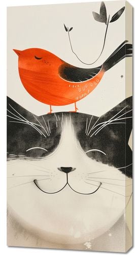 Obraz z serii abstrakcja zatytułowany Pyzaty Przyjaciel przedstawia uroczą, minimalistyczną ilustrację czarno-białego kota z zamkniętymi oczami i szerokim uśmiechem, na którego głowie spoczywa radosny, czerwony ptaszek. Kot ma charakterystyczne białe obszary wokół pyszczka, na którym wyraźnie rysują się czarne wąsy i delikatny nos. Ptaszek wydaje się być zadowolony, śpiewający, z zamkniętymi oczkami, co dodaje kompozycji wesołego i spokojnego nastroju. Tło jest jasne, z subtelnymi plamami i kropkami, które mogą imitować subtelny efekt spękanego płótna lub papieru. Po lewej stronie, na górze, widoczna jest wschodnia pieczęć, co nadaje pracy szczyptę orientalnego charakteru. Ta grafika mogłaby być idealnym, ciepłym dodatkiem do przestrzeni domowej, zwłaszcza do pokoju dziecka lub jako element dekoracyjny w przestrzeni wspólnej, przynoszący uśmiech i poczucie spokoju.