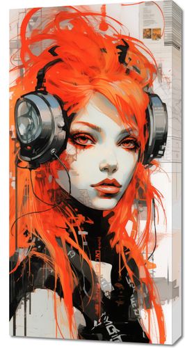 Obraz z serii pop art zatytułowany Rytm Metropolii. Dynamiczna kompozycja łączy portret kobiety o wyrazistych, pomarańczowych włosach z elementami miejskiego krajobrazu. Jej spojrzenie jest intensywne i pełne pasji, zaś duże słuchawki na uszach sugerują miłość do muzyki i rytmu wielkiego miasta. Abstrakcyjne linie i kształty, mieszające się z realistycznie oddaną postacią, tworzą wrażenie ruchu i pulsującej energii. To dzieło sztuki jest idealne dla miłośników muzyki, street artu i nowoczesnego designu, doskonale nadając się do wnętrz loftów, studiów muzycznych czy awangardowych salonów, które pragną podkreślić miejski charakter swojej przestrzeni.