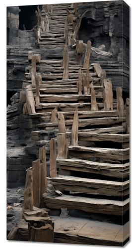 Obraz z serii pejzaże zatytułowany Schody do Nieznanego. Ten tajemniczy i intrygujący obraz przedstawia prymitywne, drewniane schody prowadzące w górę przez strukturę przypominającą starożytną ruiny lub naturalne formacje skalne. Zanurzone w półmroku, schody te wydają się zapraszać odkrywców do podjęcia podróży w nieznane, pełnej nieoczekiwanych odkryć. Obraz ten idealnie oddaje uczucie odkrycia i przygody, idealny dla przestrzeni zainspirowanych historią, naturą, czy literaturą eksploracyjną. Może stanowić inspirujący element w domach, biurach, a także w przestrzeniach publicznych takich jak kawiarnie tematyczne lub księgarnie.