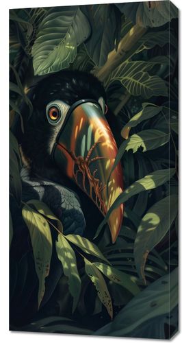 Obraz z serii natura zatytułowany Skryty Tukan przedstawia zaskakujący i intensywny portret tukana, zanurzonego w gęstej, tropikalnej zieleni. Ptak ma swoje charakterystyczne, kolorowe dziob w odcieniach pomarańczy i czerni, który odbija światło, tworząc efekt lustrzanego odbicia. Jego przenikliwe oko, obserwujące widza, dodaje głębi i charakteru kompozycji. Otaczające go rośliny są pełne detali, z subtelnymi gradiencjami kolorów i światłocieni, co tworzy efekt trójwymiarowości i ukrycia. Ta ilustracja emanuje tajemnicą tropikalnego lasu, gdzie natura i dzikie zwierzęta współistnieją w delikatnej równowadze. Obraz ten jest idealny dla przestrzeni, które cenią sobie piękno natury i chcą wprowadzić element dzikiej, nieujarzmionej przyrody do swojego otoczenia.