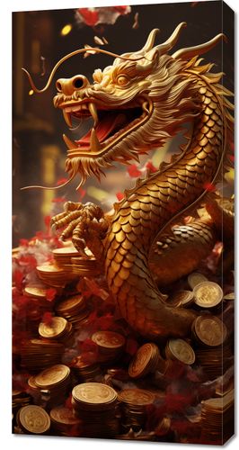 Obraz z serii motywy wschodnie zatytułowany Smok Bogactwa. Ilustracja ta ukazuje potężnego złotego smoka, symbol siły i pomyślności w wielu kulturach wschodnich, unoszącego się nad skarbami. Smok, z szeroko otwartymi szczękami, wydaje się ryczeć triumfalnie, otoczony przez wirujące złote monety i kwiaty, co dodaje kompozycji dynamizmu. Żywe kolory i szczegółowe wykonanie smoka sprawiają, że obraz jest pełen życia i energii. Obraz ten jest doskonałym wyborem dla miłośników sztuki orientalnej oraz jako element dekoracyjny wnętrz, które chcą wprowadzić elementy bogatej symboliki i kulturowej głębi, takich jak domowe biura, pokoje do medytacji czy ekskluzywne salony.