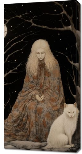 Obraz z serii wnętrza zatytułowany Stróżka Leśna. Ta eteryczna praca artystyczna ukazuje postać kobiecą, owiniętą w szatę z motywem leśnym, zatopioną w kontemplacji pod gałęziami drzew oplecionych przez śnieg i w blasku pełnego księżyca. Jej spokojna obecność i blady odcień skóry kontrastują z ciemnością nocy, a towarzyszący jej biały wilk dodaje elementu dzikości i tajemniczości. Obraz oddaje uczucie spokoju i jedności z naturą, a jednocześnie wzbudza ciekawość dotyczącą ukrytych opowieści i starych legend. Idealny dla miłośników fantastyki, mitologii, oraz tych, którzy pragną wprowadzić do swojego wnętrza elementy oniryczne i magiczne.