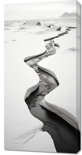 Obraz z kolekcji pejzaże zatytułowany Meandry Mrozu. Ten obraz przedstawia sinący lodowiec, którego szczeliny przecinają śnieżnobiałą powierzchnię, tworząc naturalne dzieło sztuki. Monochromatyczna paleta barw, gdzie biel śniegu kontrastuje z głębokim czerniami wód lodowcowych, przemawia do wyobraźni i wywołuje uczucie surowości oraz majestatu natury. Doskonały do wnętrz o minimalistycznym designie lub jako mocny wizualny akcent w przestrzeniach takich jak salony, biura i lobby hotelowe, gdzie może inspirować do refleksji nad pięknem i siłą przyrody.