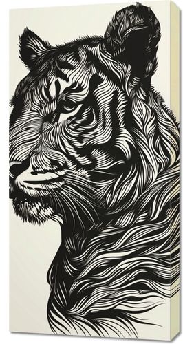 Obraz z serii wnętrza zatytułowany Tygrysi Gwizd. Ta dramatyczna grafika przedstawia tygrysa w stylu linorytu, z wyraźnymi, płynnymi liniami układającymi się w złożony wzór futra. Monochromatyczna paleta, z ciemnymi i jasnymi odcieniami na neutralnym tle, podkreśla majestatyczną postawę i intensywny wzrok tego dzikiego zwierzęcia. Obraz emanuje siłą i elegancją, oddając w pełni królewski charakter tygrysa. Idealny do wnętrz urządzonych w stylu minimalistycznym lub nowoczesnym, będzie także pasował do przestrzeni, które chcą podkreślić motywy przyrodnicze lub eksplorować tematykę ochrony dzikiej przyrody.